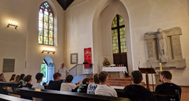 Bei strahlendem Sonnenschein pilgerte eine Gruppe von Maturant:innen unserer Schule, begleitet vom Weggefährten, Philipp Supper, bischöflicher Referent und ihrer Religionslehrerin, Yvonne Kaltenberger, vom Kirchplatz in Hard zum Kloster Mehrerau in Bregenz.