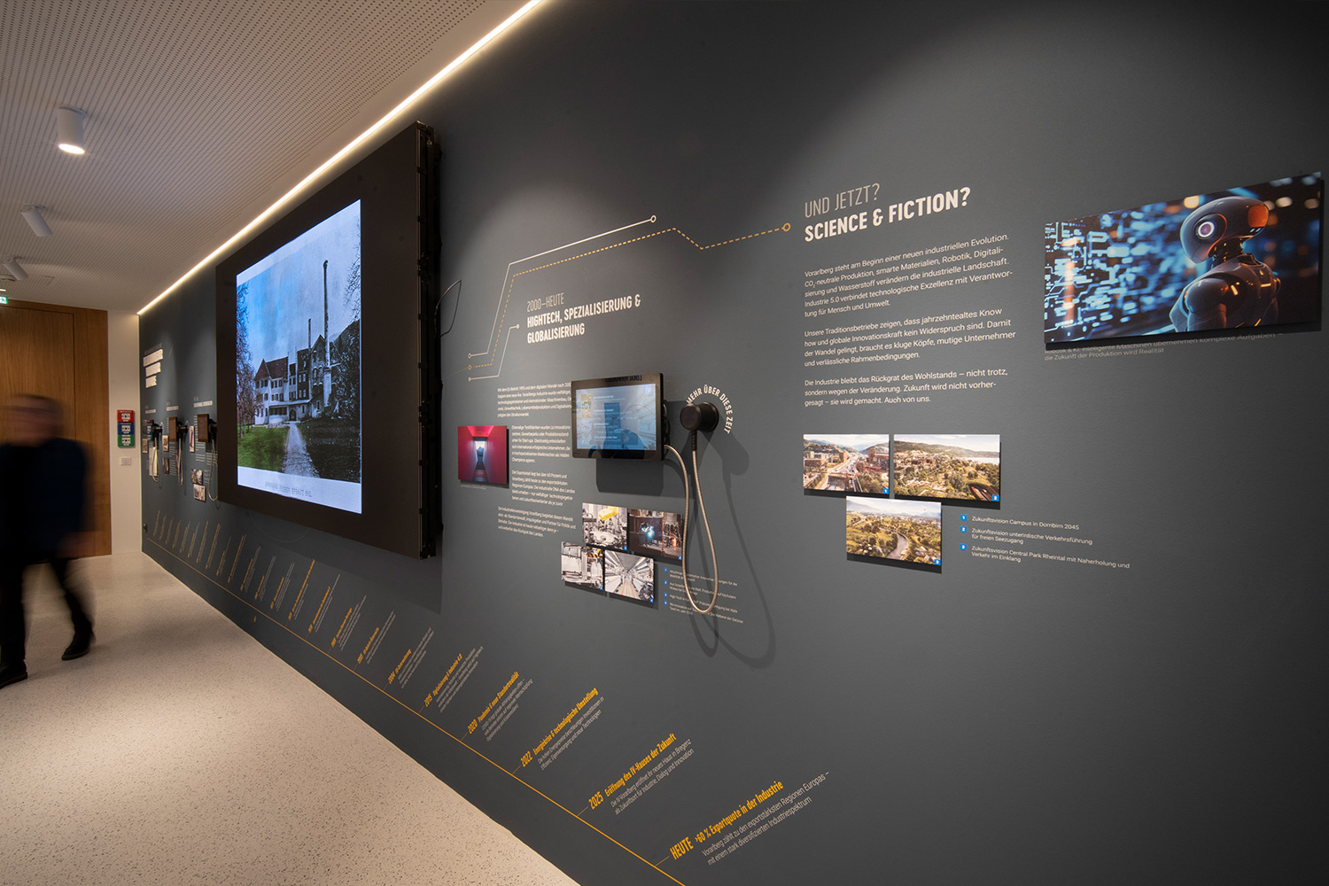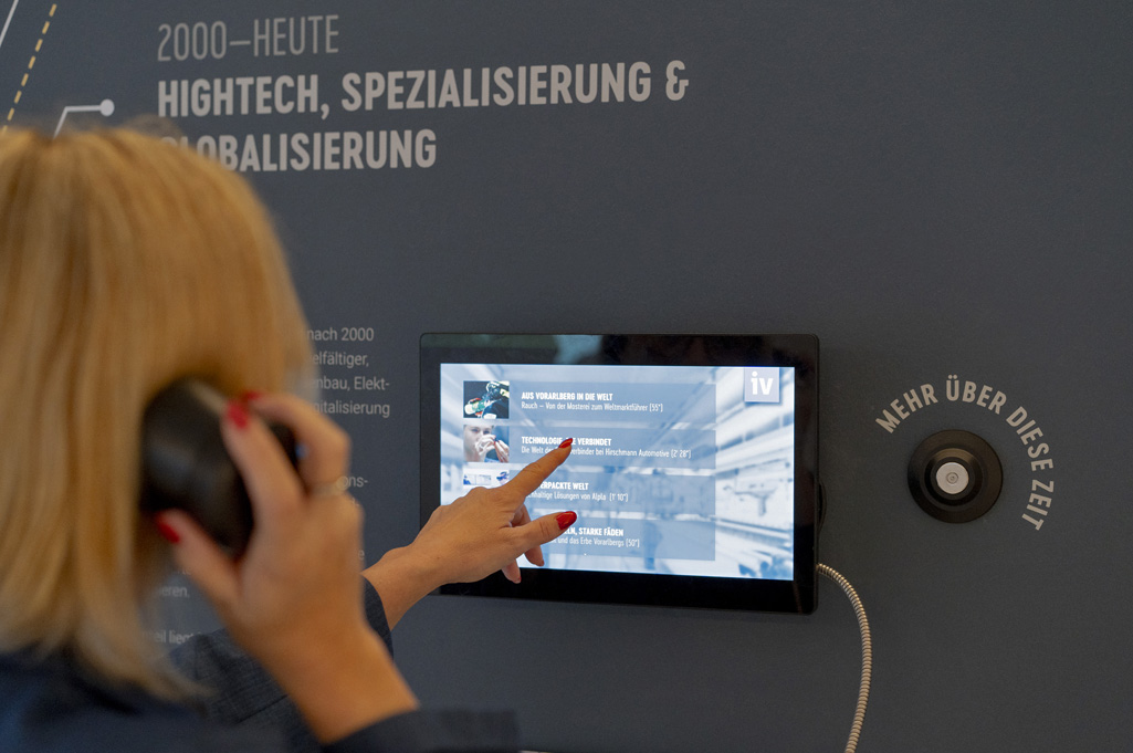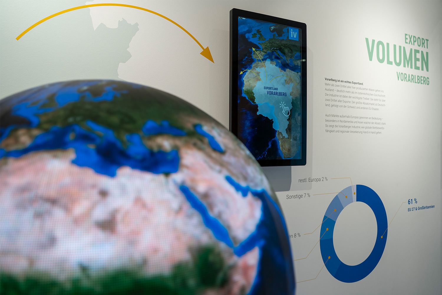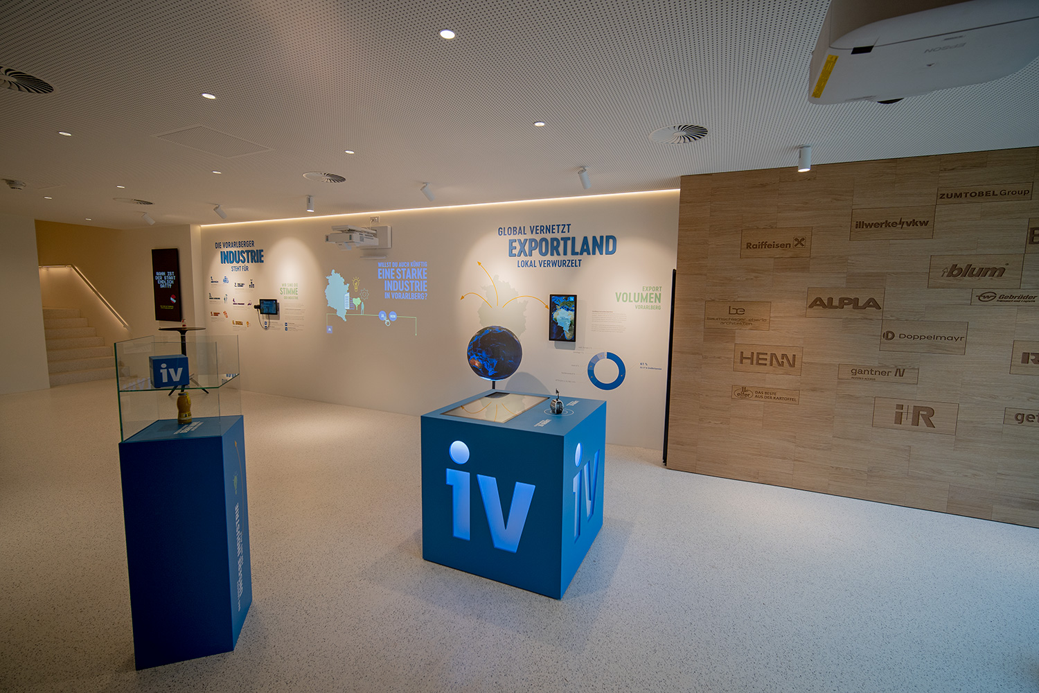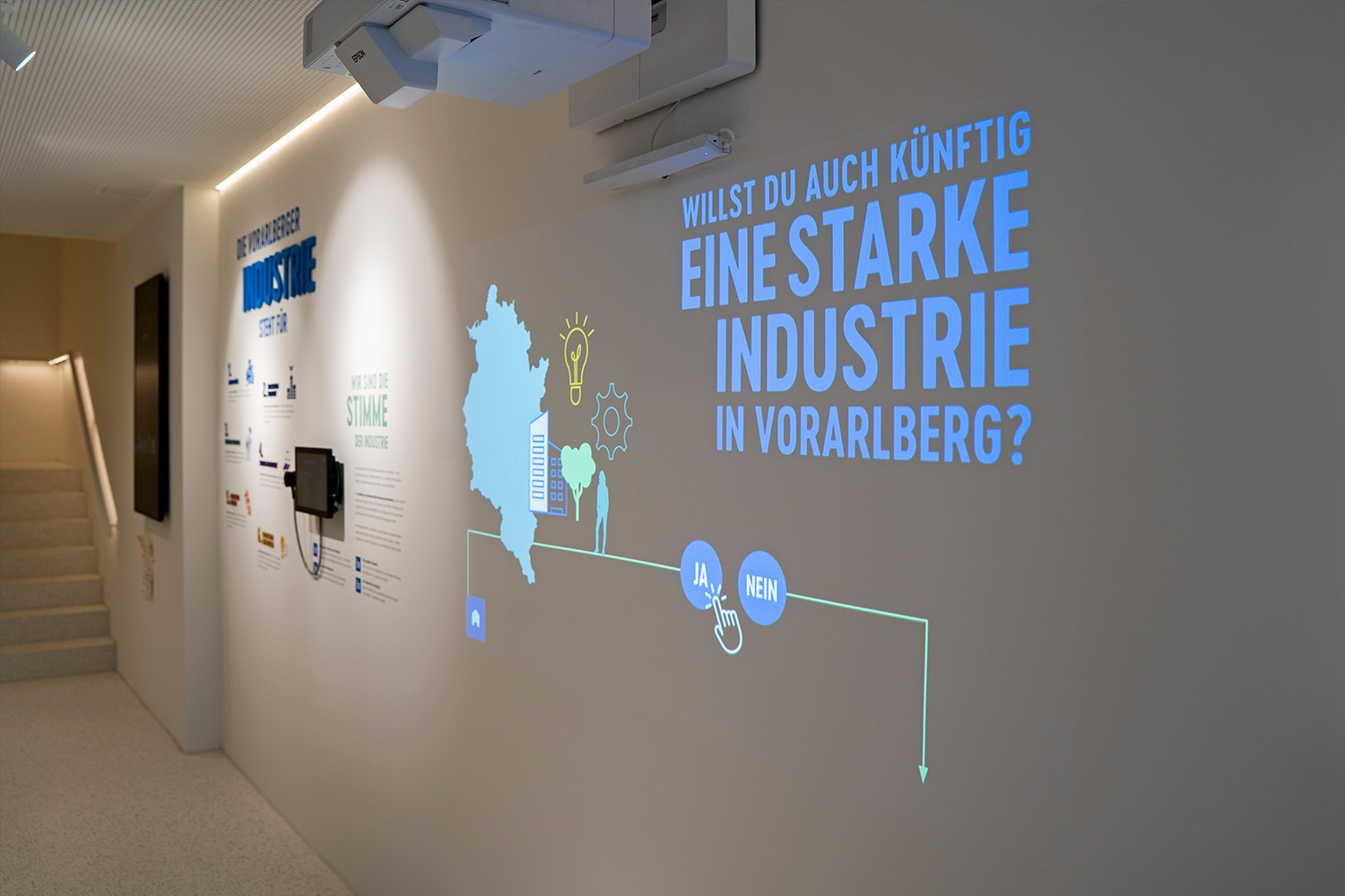 Ein besonderes Highlight für die 4adb war die ausführliche Präsentation des Konzepts und der technischen Umsetzung der interaktiven Installationen, die im Haus der Wirtschaft als modernes Kommunikations- und Informationsmedium dient. Die Schüler:innen erfuhren, wie das Zusammenspiel aus Medientechnik, Gestaltung und Botschaften genutzt wird, um die Leistungen der Vorarlberger Industrie erlebbar zu machen.