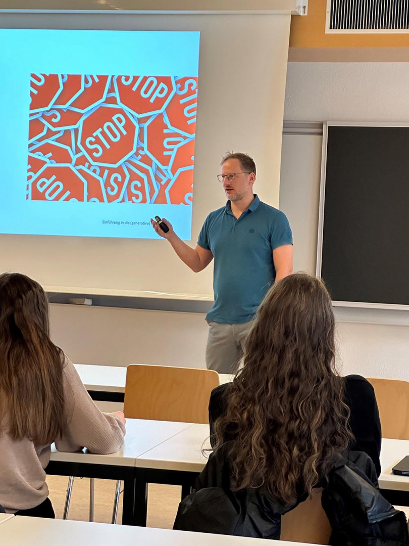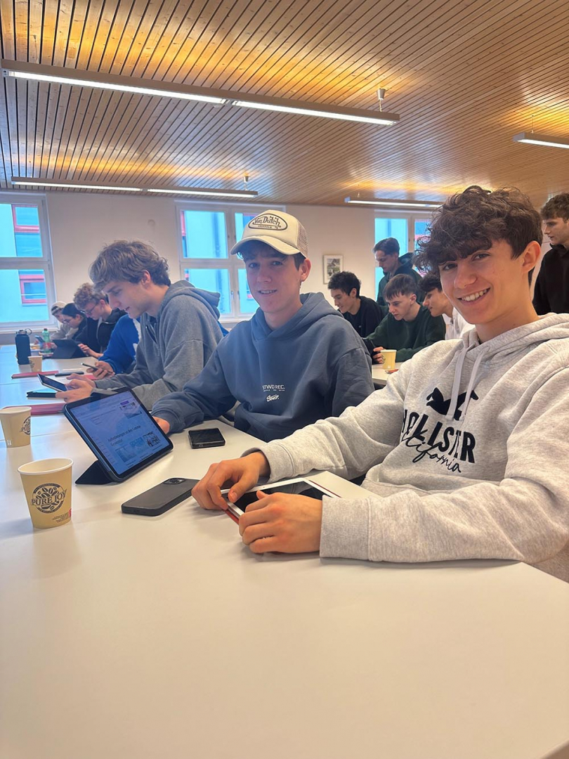 Der hochmotivierte Ass.-Prof. Sebastian Stöckl ging dabei auf verschiedene Fragen ein. Insbesondere referierte er zu den Inhalten, wie KI funktioniert, wie lang es KI bereits gibt, was KI alles kann, wo sie hilfreich und wo sie gefährlich sein kann. Lena Burtscher: „Wir durften sogar selber mit Hilfe von KI eine Homepage erstellen. Das war sehr interessant! Besonders zu erfahren, was KI alles schon kann.“
