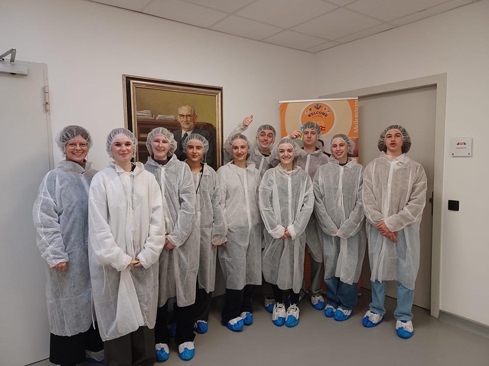 Nachdem alle Fragen beantwortet waren, war es Zeit, um einen Einblick in die Käseproduktion des großen Familienunternehmens zu bekommen. Bevor wir in die Produktion eintreten durften, mussten aufwändige Hygienemaßnahmen getroffen werden: ausgestattet mit Haarnetz, Mantel, und Schuhüberzügen durchliefen wir eine mehrstufige Desinfektions-Schleuse. Anschließend begann die Führung auch schon. Was sofort auffiel, war der starke Käsegeruch. Zuerst wurde uns gezeigt, wie die Zutaten geschmolzen und verarbeitet werden. Danach wurden wir in die Prüfungs-Abteilung geführt, in welcher getestet wird, ob der hergestellte Käse die nötigen Ansprüche erfüllt, um verkauft zu werden. Anschließend wurde gezeigt, wie der Käse verpackt wird. Dies geschieht mit hoch modernen Maschinen, die die Käsestücke vollautomatisch blitzschnell in ihre Verpackung einwickeln.